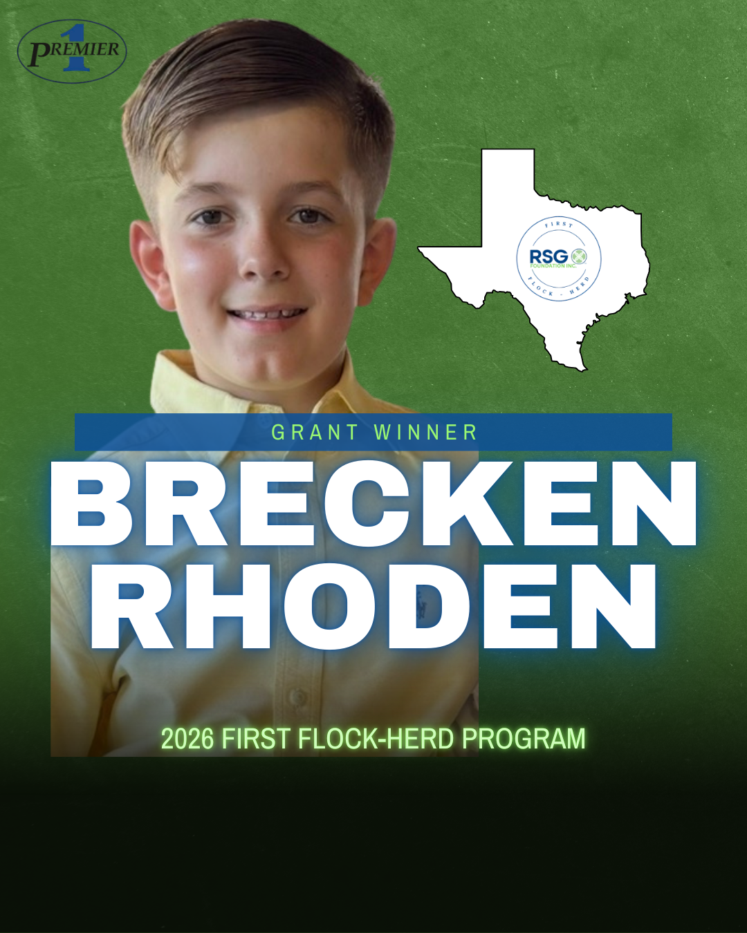 The RSG Foundation is proud to announce the winners of the 2026 First Flock-Herd Grant Program, a national initiative designed to support young and aspiring livestock producers in acquiring their first breeding sheep or goat. Get to know one of our sixteen grant recipients below: Brecken is a 9-year-old fourth-grade student at Shepherd Intermediate School. Outside of school, he enjoys reading, hunting, and playing baseball. Brecken is very excited about this opportunity and looks forward to learning more about lamb breeding and participating in showing sheep. If you would like to donate to the RSG Foundation to provide opportunities like this in the future, check out our website. |